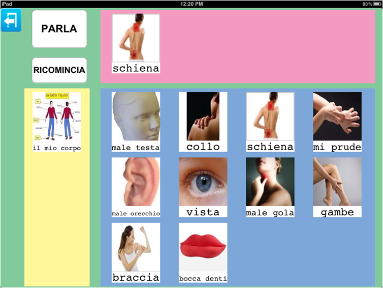 Parla con un Click offre la possibilità di creare tabelle che facilitino, attraverso il gioco, la discriminazione e il riconoscimento parte/tutto degli oggetti (come in questo esempio), ma potrebbero essere anche utilizzate per facilitare la discriminazione delle diverse parti del volto e/o delle differenti configurazioni emotive.