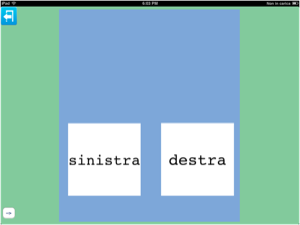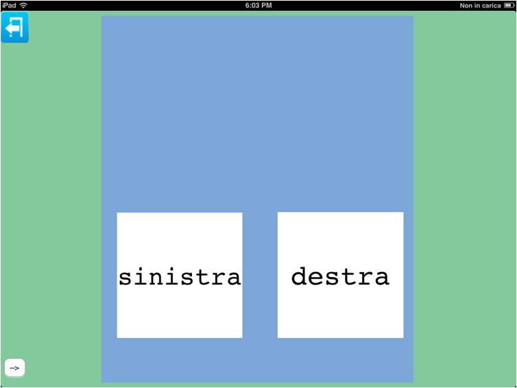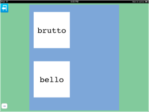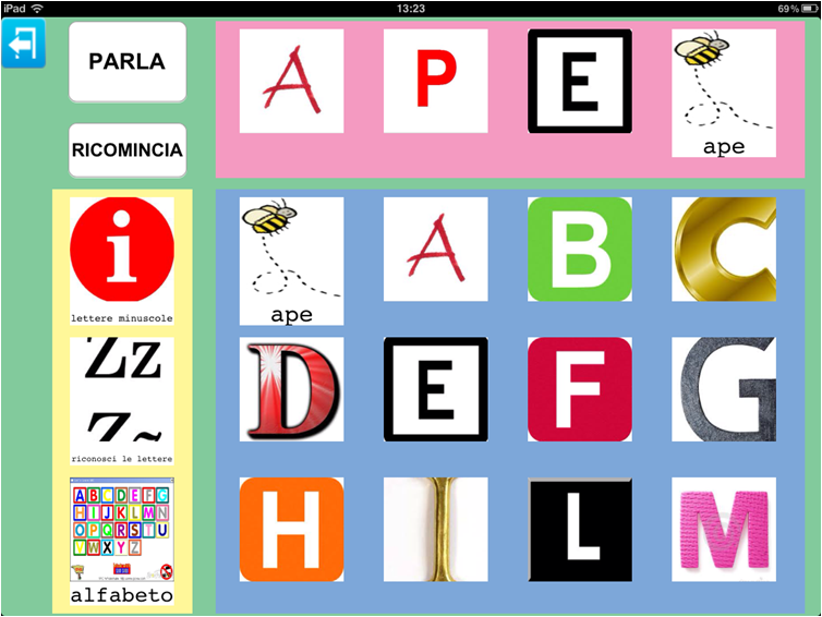 Questa schermata offre un esempio di come le lettere possano essere utilizzate non solo come introduzione al codice alfabetico, ma anche come introduzione ai differenti suoni di ciascuna lettera e delle loro possibili combinazioni di sillabe, fino a formare la parola.