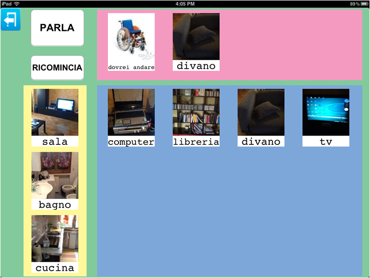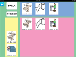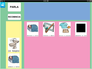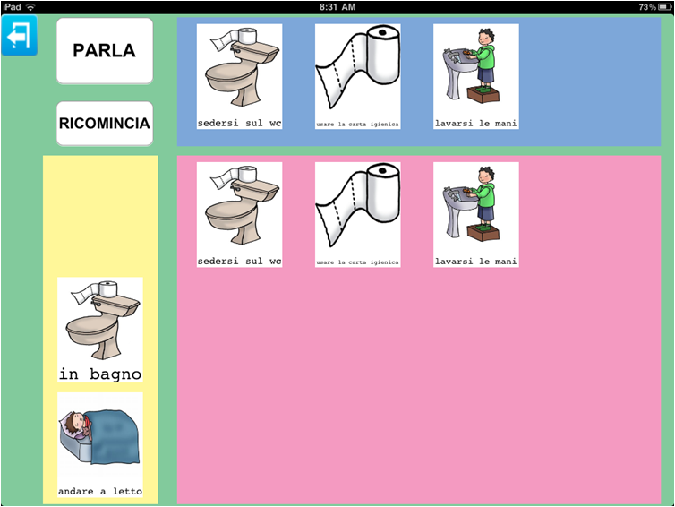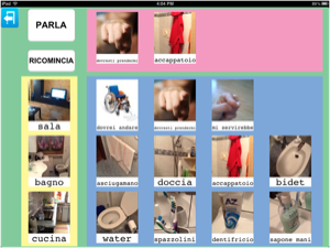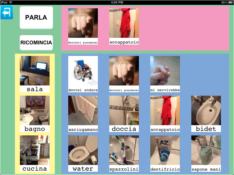Anche in questo caso, gli oggetti della stanza sono stati associati a tre possibili immagini del parlato, tuttavia anche in questo caso era possibile inserirne altre per esempio relative a commenti (non mi piace lavare i denti) oppure inserire la sequenza d'azioni dell'andare in bagno, come promemoria dell'ordine delle azioni da eseguire.