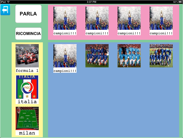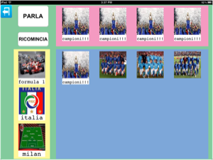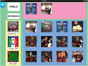 Questo esempio consente all'utente di Parla con un Click di raccogliere ciò lo appassiona, e condividerlo con altri.In questi esempi sono raffigurati solo gli oggetti di una determinata passione sportiva, quali calciatori, e macchine, tuttavia, anche in questo caso è possibile introdurre immagini del parlato atte a richiedere informazioni (sai cos'ha fatto il milan?), opinioni (cosa ne pensi del rigore?) o chiarimenti (perché l'ha espulso) oppure semplicemente per esprimere la propria 'visione dei fatti'.