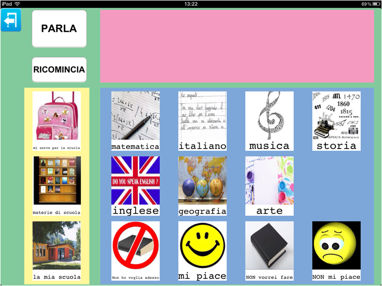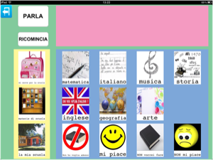 In questo esempio è possibile notare l'affiancamento di immagini raffiguranti le materie scolastiche con immagini del parlato che consentano esprimere un desiderio o un'opinione. Anche in questo caso le immagini del parlato potevano essere diverse ed essere caratterizzate da domande (posso fare una domanda?), affermazioni (lo so!), etc.