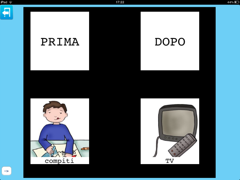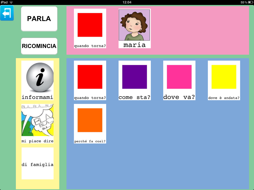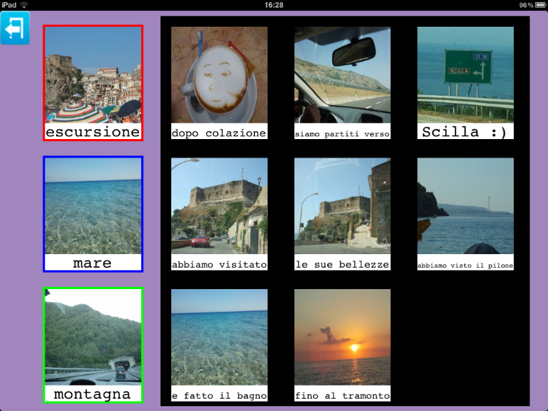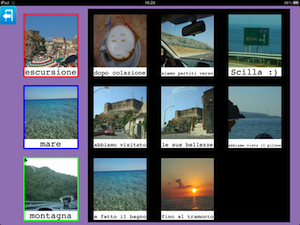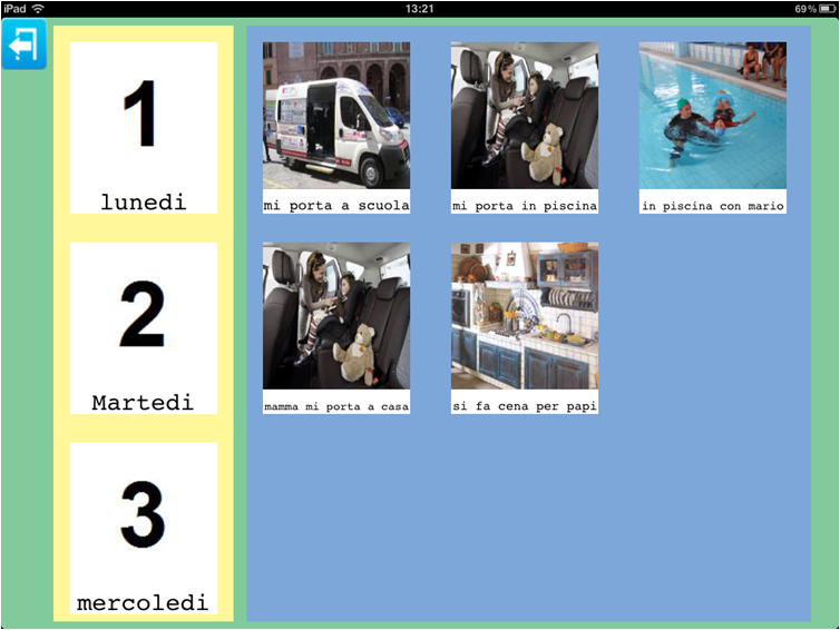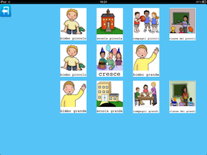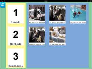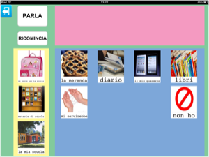 Un'altra possibilità è quella di creare insieme all'insegnante o educatore, una categoria che riassuma quanto è stato fatto durante la giornata a scuola per poterlo raccontare in un successivo momento. Insegnante e utente potrebbero decidere insieme le immagini da inserire e l'audio da registrare. Un ipotetico inizio:' sai mamma cosa ho fatto oggi?' audio registrato sopra l'immagine '?'