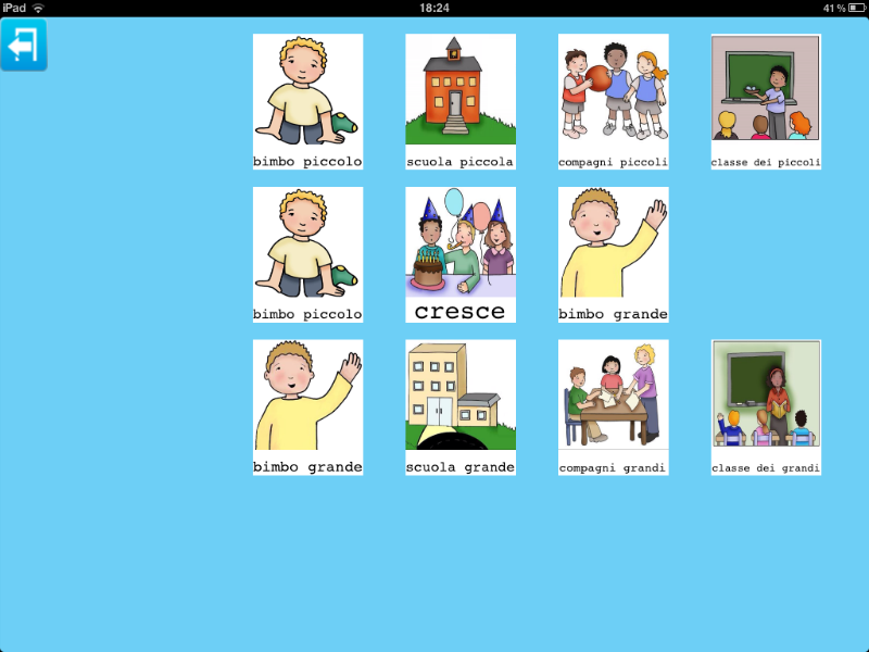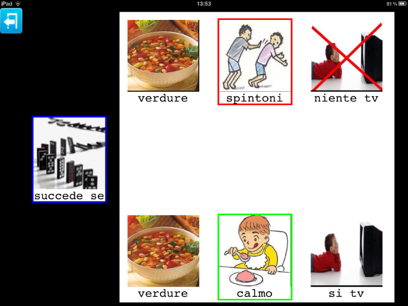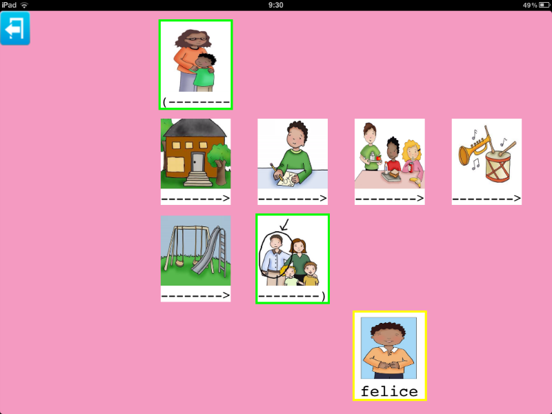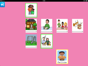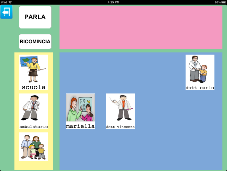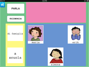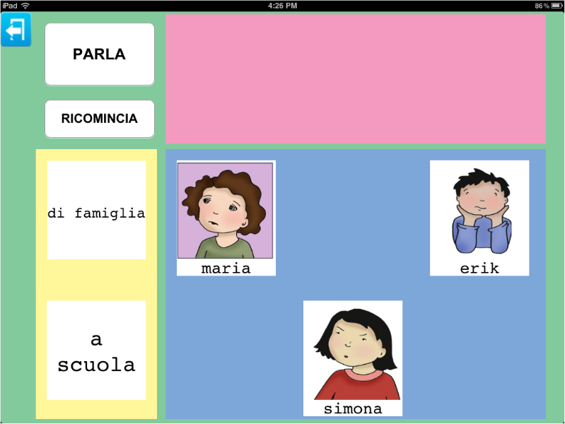 Nell'esempio sono state inseriti disegni, che tuttavia possono essere sostituiti da una fotografia della persona. Allo stesso modo, le categorie sono descritte da testo (famiglia, a scuola) ma anche in questo caso delle immagini possono sostituire il testo.
